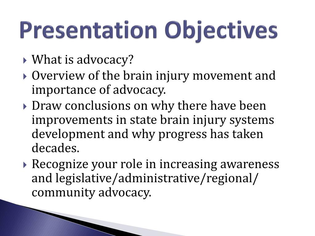 Presentation Objectives • What is advocacy? • Overview of the brain injury movement and importance of advocacy. • Draw conclusions on why there have been improvements in state brain injury systems development and why progress has taken decades. • Recognize your role in increasing awareness and legislative/administrative/regional/ community advocacy.