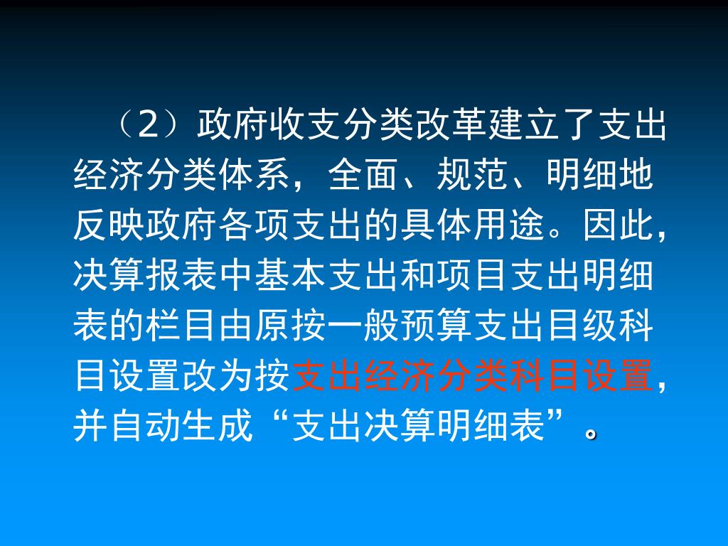 (2)政府收支分类改革建立了支出经济分类体系,全面、规范、明细地反映政府各项支出的具体用途。因此,决算报表中基本支出和项目支出明细表的栏目由原按一般预算支出目级科目设置改为按支出经济分类科目设置,并自动生成“支出决算明细表”。(2)政府收支分类改革建立了支出经济分类体系,全面、规范、明细地反映政府各项支出的具体用途。因此,决算报表中基本支出和项目支出明细表的栏目由原按一般预算支出目级科目设置改为按支出经济分类科目设置,并自动生成“支出决算明细表”。