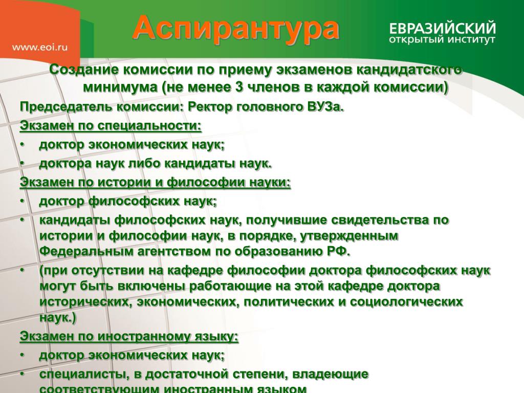 Создание комиссии по приему экзаменов кандидатского минимума (не менее 3 членов в каждой комиссии) Председатель комиссии: Ректор головного ВУЗа. Экзамен по специальности: доктор экономических наук; доктора наук либо кандидаты наук. Экзамен по истории и философии науки: доктор философских наук; кандидаты философских наук, получившие свидетельства по истории и философии наук, в порядке, утвержденным Федеральным агентством по образованию РФ. (при отсутствии на кафедре философии доктора философских наук могут быть включены работающие на этой кафедре доктора исторических, экономических, политических и социологических наук.) Экзамен по иностранному языку: доктор экономических наук; специалисты, в достаточной степени, владеющие соответствующим иностранным языком Аспирантура