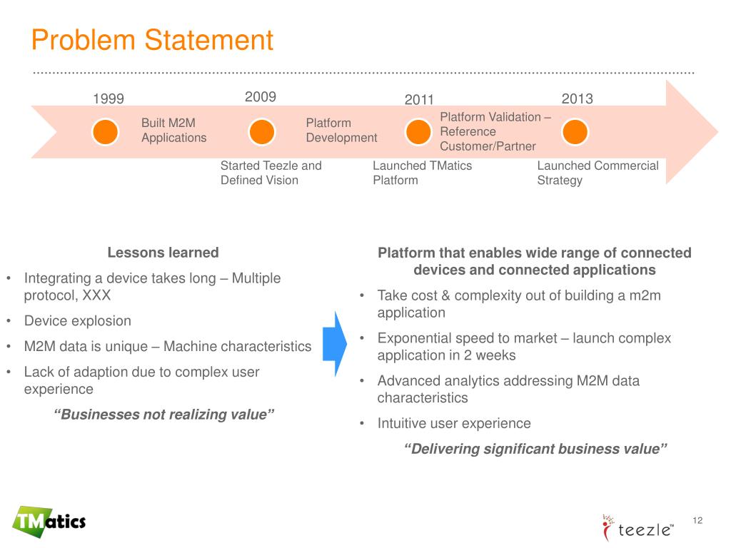 Problem Statement 2009 1999 2013 2011 Platform Validation – Reference Customer/Partner • Lessons learned • Integrating a device takes long – Multiple protocol, XXX • Device explosion • M2M data is unique – Machine characteristics • Lack of adaption due to complex user experience • “Businesses not realizing value” Built M2M Applications Platform Development Started Teezle and Defined Vision Launched TMatics Platform Launched Commercial Strategy • Platform that enables wide range of connected devices and connected applications • Take cost & complexity out of building a m2m application • Exponential speed to market – launch complex application in 2 weeks • Advanced analytics addressing M2M data characteristics • Intuitive user experience • “Delivering significant business value”
