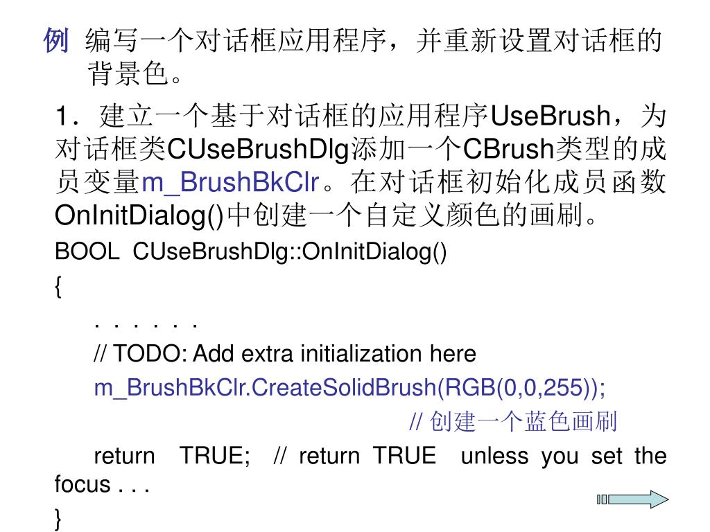 例编写一个对话框应用程序,并重新设置对话框的背景色。例编写一个对话框应用程序,并重新设置对话框的背景色。 1.建立一个基于对话框的应用程序UseBrush,为对话框类CUseBrushDlg添加一个CBrush类型的成员变量m_BrushBkClr。在对话框初始化成员函数OnInitDialog()中创建一个自定义颜色的画刷。 BOOL CUseBrushDlg::OnInitDialog() { . . . . . . // TODO: Add extra initialization here m_BrushBkClr.CreateSolidBrush(RGB(0,0,255)); // 创建一个蓝色画刷 return TRUE; // return TRUE unless you set the focus . . . }