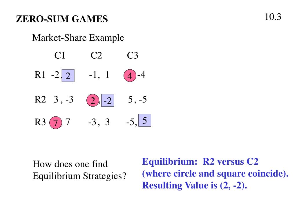 10.3 ZERO-SUM GAMES Market-Share Example C1 C2 C3 R1 -2 -1 4 R2 3 2 5 R3 7 -3 -5 , 2 , 1 , -4 , -3 , -2 , -5 , 7 , 3 , 5 2 4 2 -2 5 7 Equilibrium: R2 versus C2 (where circle and square coincide). Resulting Value is (2, -2). How does one find Equilibrium Strategies?