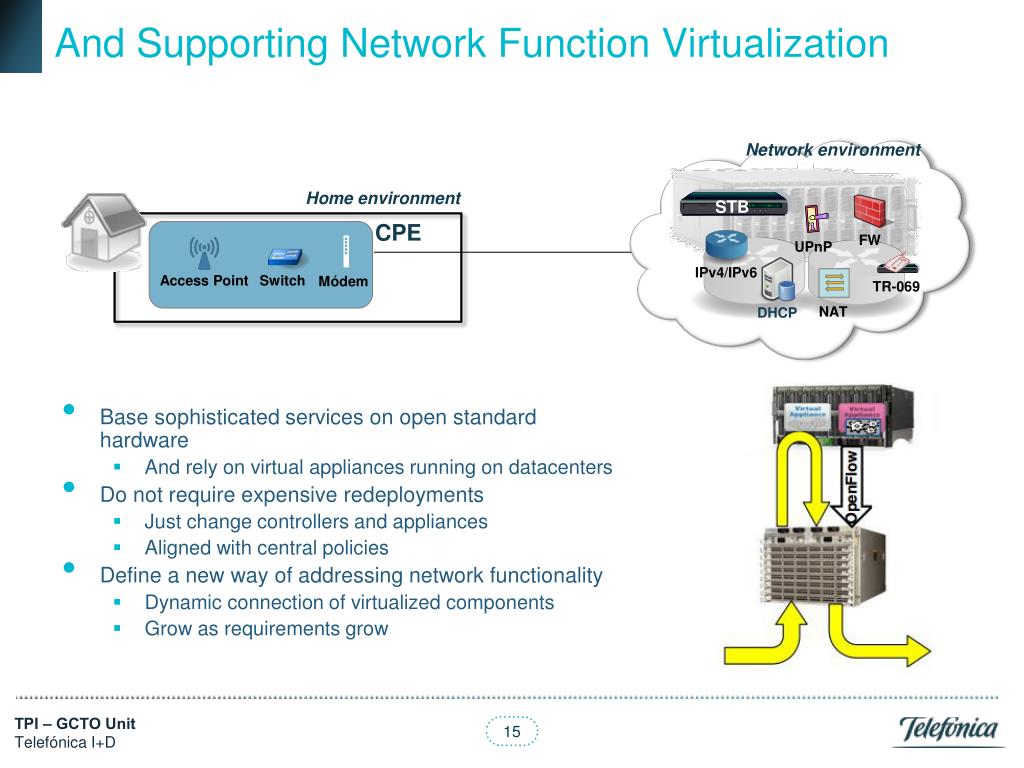 And Supporting Network Function Virtualization STB • Base sophisticated services on open standard hardware • And rely on virtual appliances running on datacenters • Do not require expensive redeployments • Just change controllers and appliances • Aligned with central policies • Define a new way of addressing network functionality • Dynamic connection of virtualized components • Grow as requirements grow Network environment IPv4/IPv6 NAT FW Home environment CPE Módem Access Point DHCP Switch UPnP TR-069