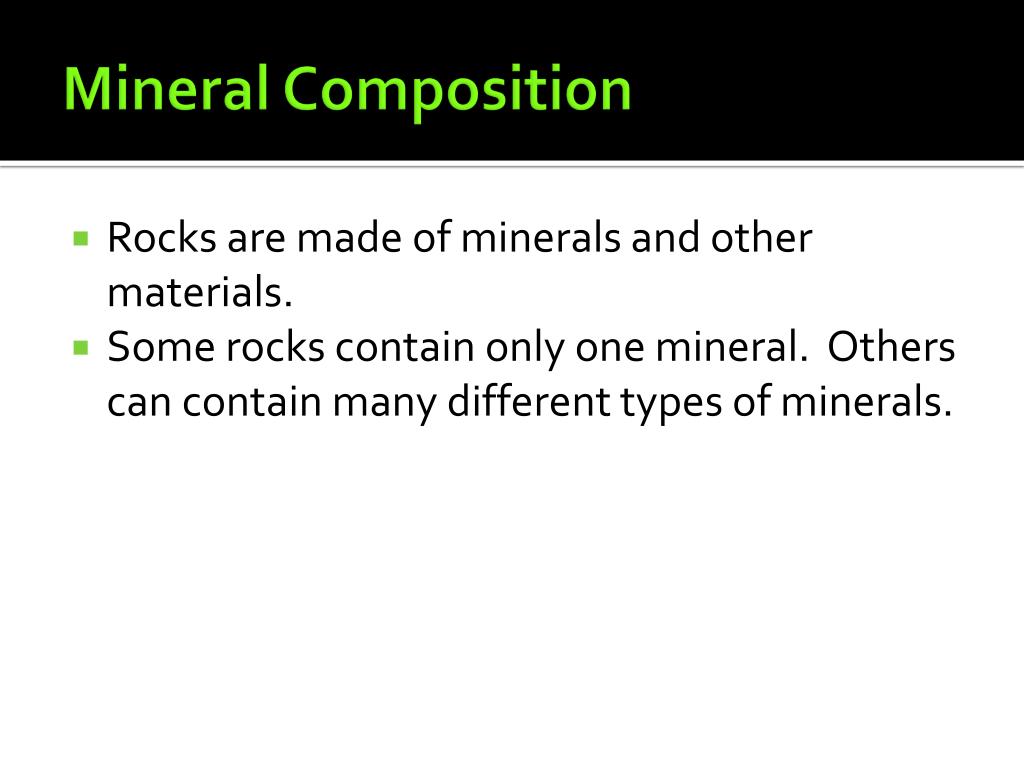Mineral Composition • Rocks are made of minerals and other materials. • Some rocks contain only one mineral. Others can contain many different types of minerals.