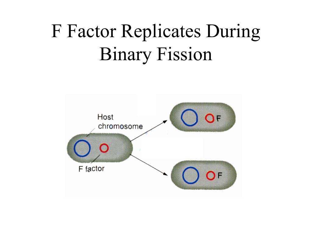 Properties of the F Factor • Can replicate its own DNA, • Carries genes required for the synthesis of pili, • F+ and F- cells can conjugate, • the F factor is copied to the F- cell, resulting in two F+ cells, • F+ cells do not conjugate with F+ cells, • F Factor sometimes integrates into the bacterial chromosome creating Hfr cells.