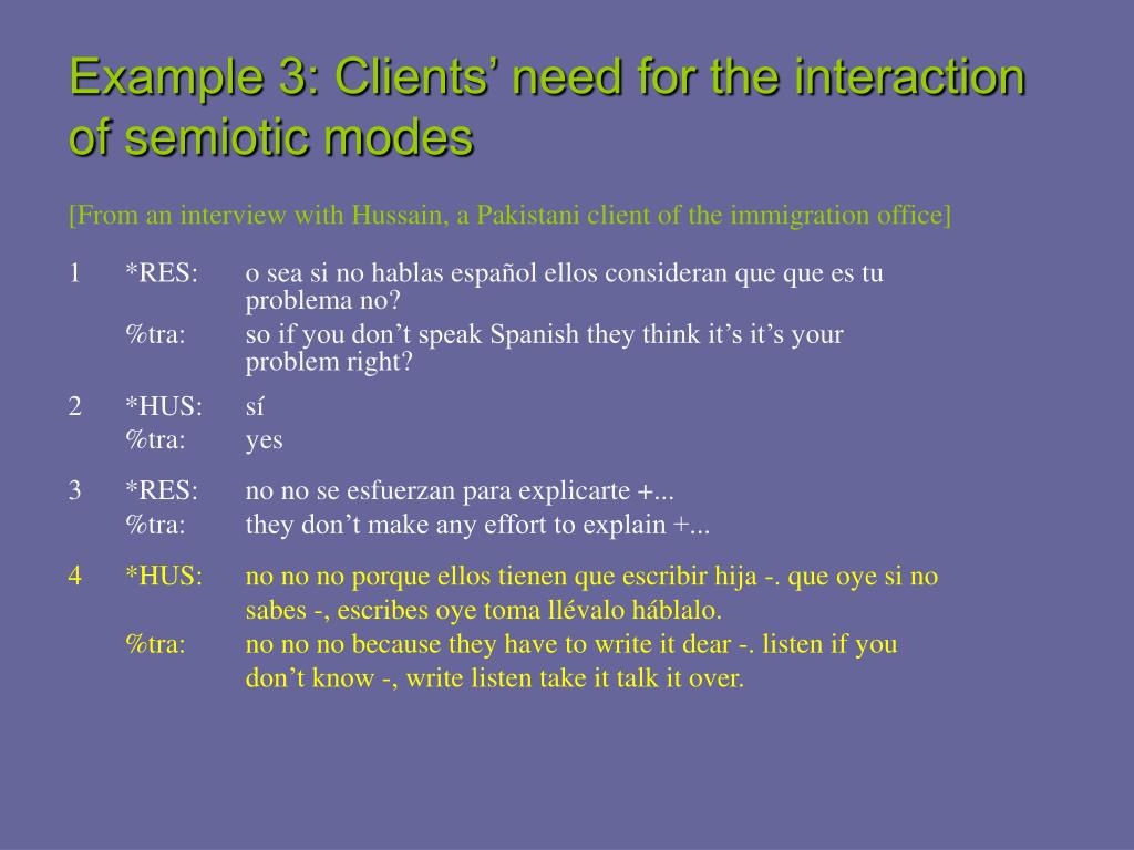 Example 3: Clients’ need for the interaction of semiotic modes [From an interview with Hussain, a Pakistani client of the immigration office] 1 *RES: o sea si no hablas español ellos consideran que que es tu problema no? %tra: so if you don’t speak Spanish they think it’s it’s your problem right? 2 *HUS: sí %tra: yes 3 *RES: no no se esfuerzan para explicarte +... %tra: they don’t make any effort to explain +... • *HUS: no no no porque ellos tienen que escribir hija -. que oye si no sabes -, escribes oye toma llévalo háblalo. %tra: no no no because they have to write it dear -. listen if you don’t know -, write listen take it talk it over.