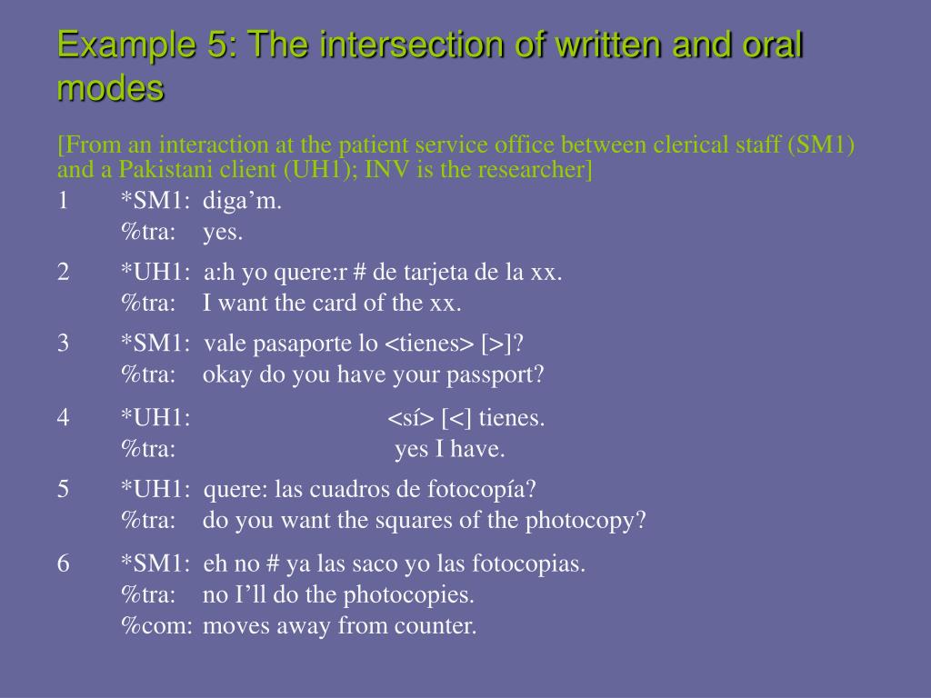 Example 5: The intersection of written and oral modes [From an interaction at the patient service office between clerical staff (SM1) and a Pakistani client (UH1); INV is the researcher] 1 *SM1: diga’m. %tra: yes. 2 *UH1: a:h yo quere:r # de tarjeta de la xx. %tra: I want the card of the xx. 3 *SM1: vale pasaporte lo <tienes> [>]? %tra: okay do you have your passport? 4 *UH1: <sí> [<] tienes. %tra: yes I have. 5 *UH1: quere: las cuadros de fotocopía? %tra: do you want the squares of the photocopy? 6 *SM1: eh no # ya las saco yo las fotocopias. %tra: no I’ll do the photocopies. %com: moves away from counter.