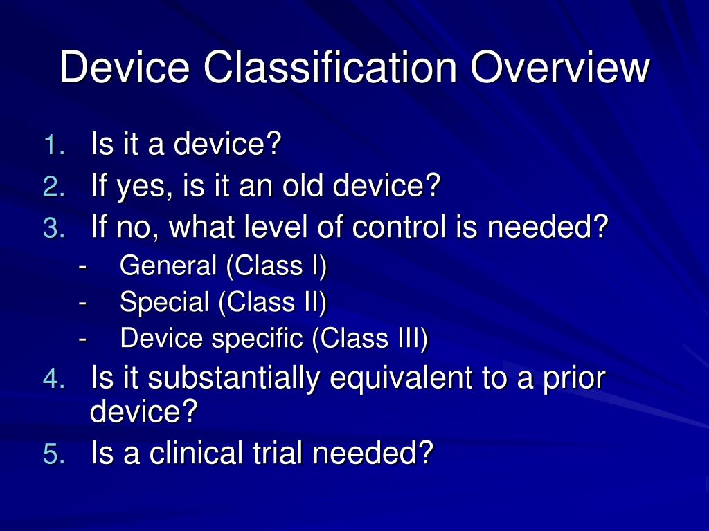 Device Classification Overview • Is it a device? • If yes, is it an old device? • If no, what level of control is needed? • General (Class I) • Special (Class II) • Device specific (Class III) • Is it substantially equivalent to a prior device? • Is a clinical trial needed?
