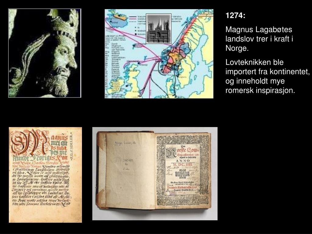 1274: Magnus Lagabøtes landslov trer i kraft i Norge. Lovteknikken ble importert fra kontinentet, og inneholdt mye romersk inspirasjon.