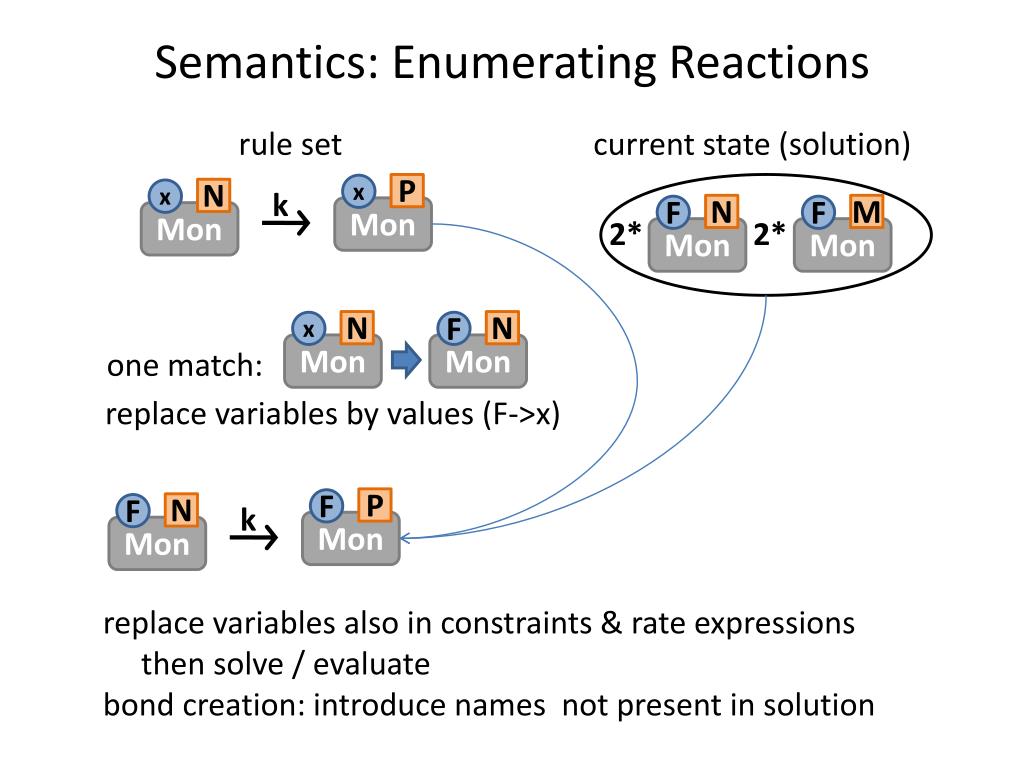 Semantics: Enumerating Reactions rule set current state (solution) k 2* 2* P M N N P N N N F x F F x F F x Mon Mon Mon Mon Mon Mon Mon Mon one match: replace variables by values (F->x) k replace variables also in constraints & rate expressions then solve / evaluate bond creation: introduce names not present in solution
