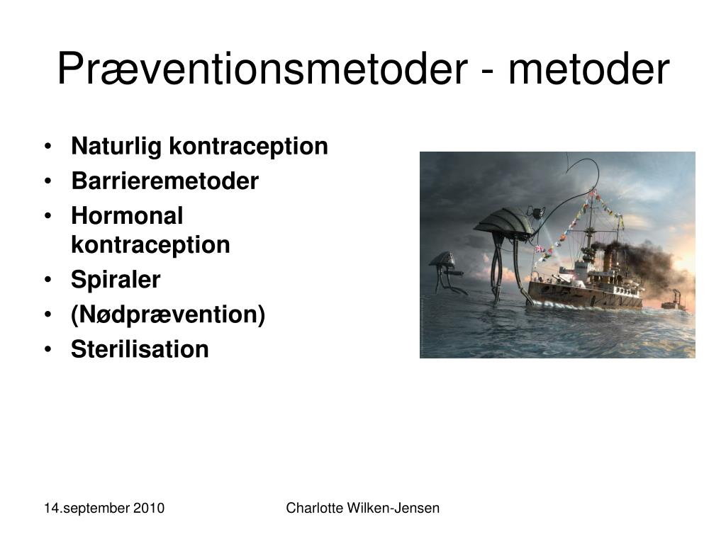 Præventionsmetoder - metoder • Naturlig kontraception • Barrieremetoder • Hormonal kontraception • Spiraler • (Nødprævention) • Sterilisation Charlotte Wilken-Jensen
