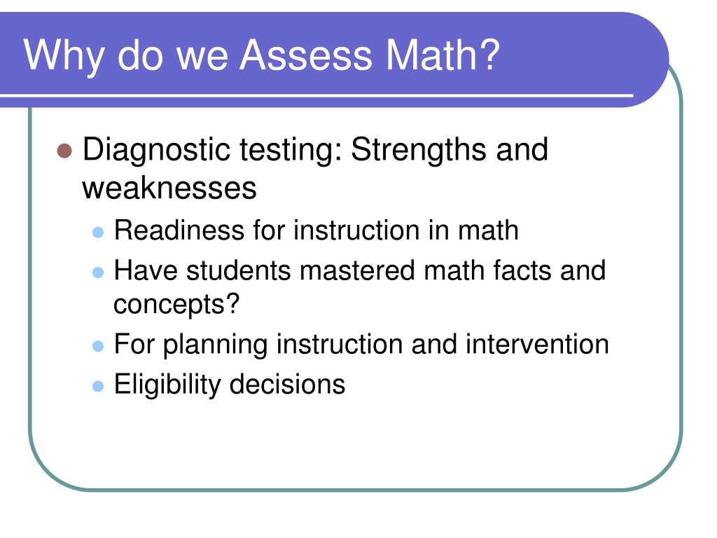 Why do we Assess Math? • Diagnostic testing: Strengths and weaknesses • Readiness for instruction in math • Have students mastered math facts and concepts? • For planning instruction and intervention • Eligibility decisions