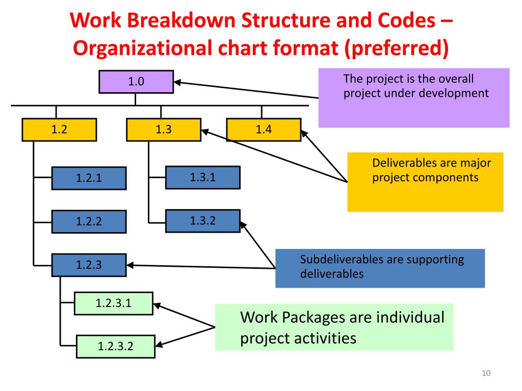 1.0 1.2 1.3 1.4 1.3.1 1.2.1 1.3.2 1.2.2 1.2.3 1.2.3.1 1.2.3.2 Work Breakdown Structure and Codes – Organizational chart format (preferred) The project is the overall project under development Work Packages are individual project activities Deliverables are major project components Subdeliverables are supporting deliverables