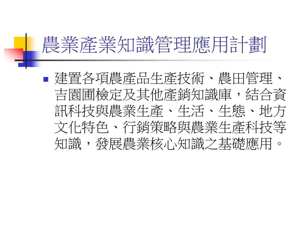農業產業知識管理應用計劃 • 建置各項農產品生產技術、農田管理、吉園圃檢定及其他產銷知識庫,結合資訊科技與農業生產、生活、生態、地方文化特色、行銷策略與農業生產科技等知識,發展農業核心知識之基礎應用。