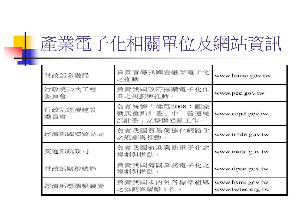 產業電子化目標 • 健全產業自動化及電子化應用環境。 • 建構高效率供應鏈管理網絡,達成最佳化供需機制。 • 協助企業佈建全球運籌營運體系,以提昇產業競爭力。