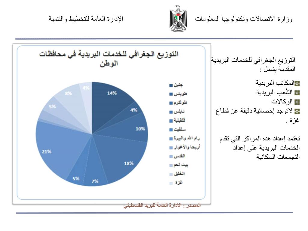 التوزيع الجغرافي للخدمات البريدية المقدمة يشمل : المكاتب البريدية الشُعب البريدية الوكالات لاتوجد إحصائية دقيقة عن قطاع غزة . تعتمد إعداد هذه المراكز التي تقدم الخدمات البريدية على إعداد التجمعات السكانية المصدر : الادارة العامة للبريد الفلسطيني