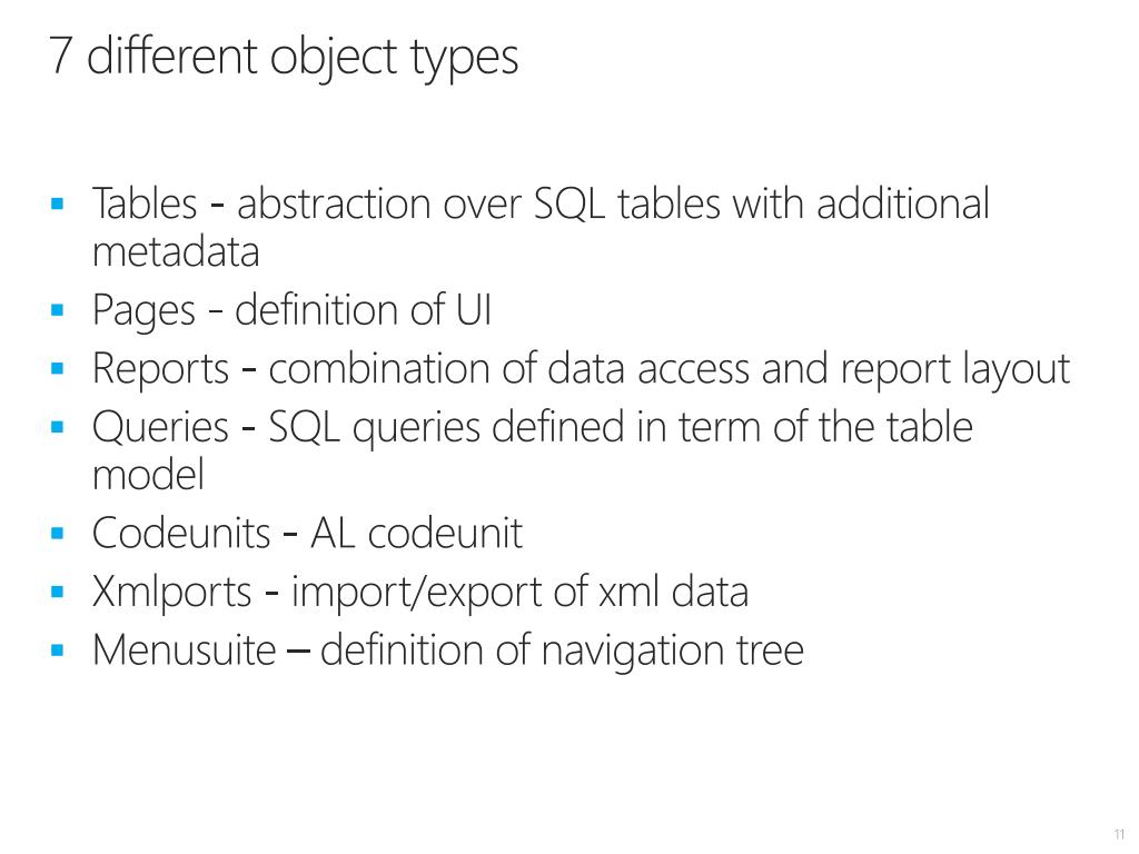 7 different object types • Tables - abstraction over SQL tables with additional metadata • Pages - definition of UI • Reports - combination of data access and report layout • Queries - SQL queries defined in term of the table model • Codeunits - AL codeunit • Xmlports - import/export of xml data • Menusuite – definition of navigation tree
