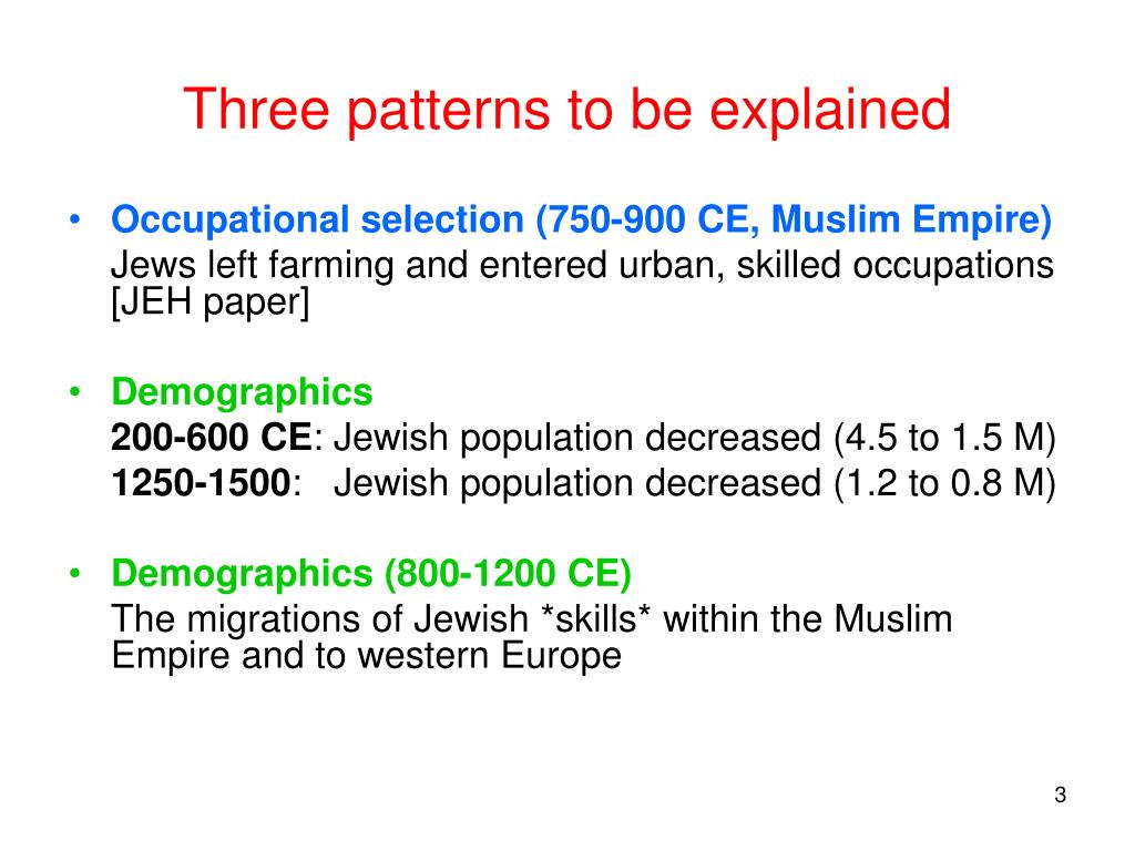 Three patterns to be explained • Occupational selection (750-900 CE, Muslim Empire) Jews left farming and entered urban, skilled occupations [JEH paper] • Demographics 200-600 CE:Jewish population decreased (4.5 to 1.5 M) 1250-1500: Jewish population decreased (1.2 to 0.8 M) • Demographics (800-1200 CE) The migrations of Jewish *skills* within the Muslim Empire and to western Europe