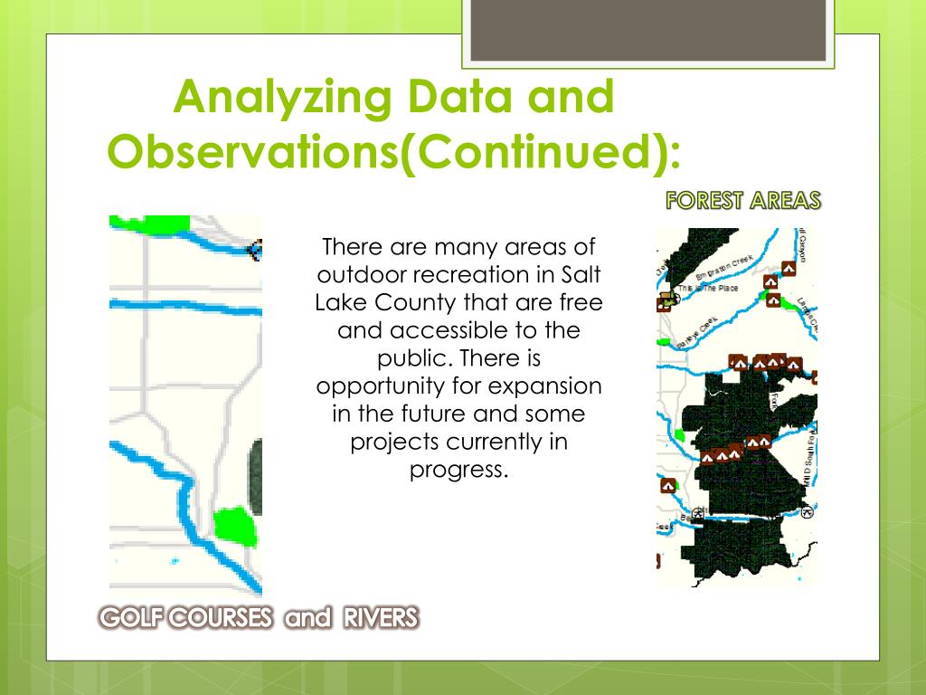 FOREST AREAS There are many areas of outdoor recreation in Salt Lake County that are free and accessible to the public. There is opportunity for expansion in the future and some projects currently in progress. Analyzing Data and Observations(Continued): GOLF COURSES and RIVERS
