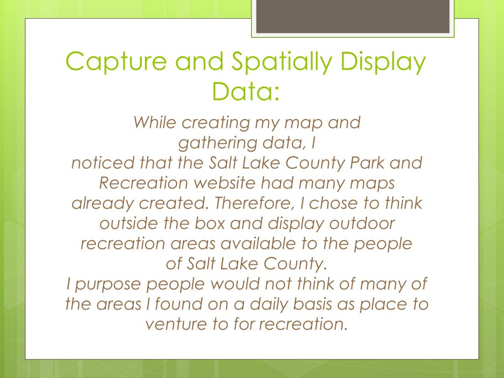 Capture and Spatially Display Data: While creating my map and gathering data, I noticed that the Salt Lake County Park and Recreation website had many maps already created. Therefore, I chose to think outside the box and display outdoor recreation areas available to the people of Salt Lake County. I purpose people would not think of many of the areas I foundon a daily basis as place to venture to for recreation.