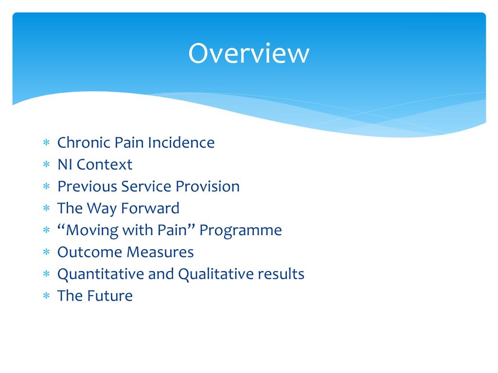 Overview Chronic Pain Incidence NI Context Previous Service Provision The Way Forward “Moving with Pain” Programme Outcome Measures Quantitative and Qualitative results The Future