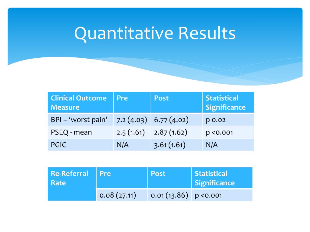 Outcomes Measures Outcome measures were chosen in accordance with the IMMPACT recommendations of core outcome measures in chronic pain clinical trials (Dworkin et al, 2005) BPI, PSEQ, PGIC A qualitative study was conducted to capture service users’ lived experience with chronic pain Re-referral rates to the physiotherapy were also examined