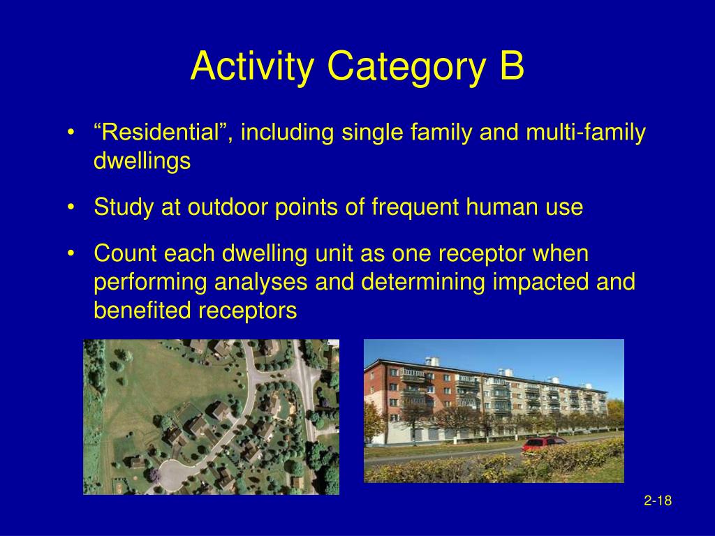 Activity Category B • “Residential”, including single family and multi-family dwellings • Study at outdoor points of frequent human use • Count each dwelling unit as one receptor when performing analyses and determining impacted and benefited receptors