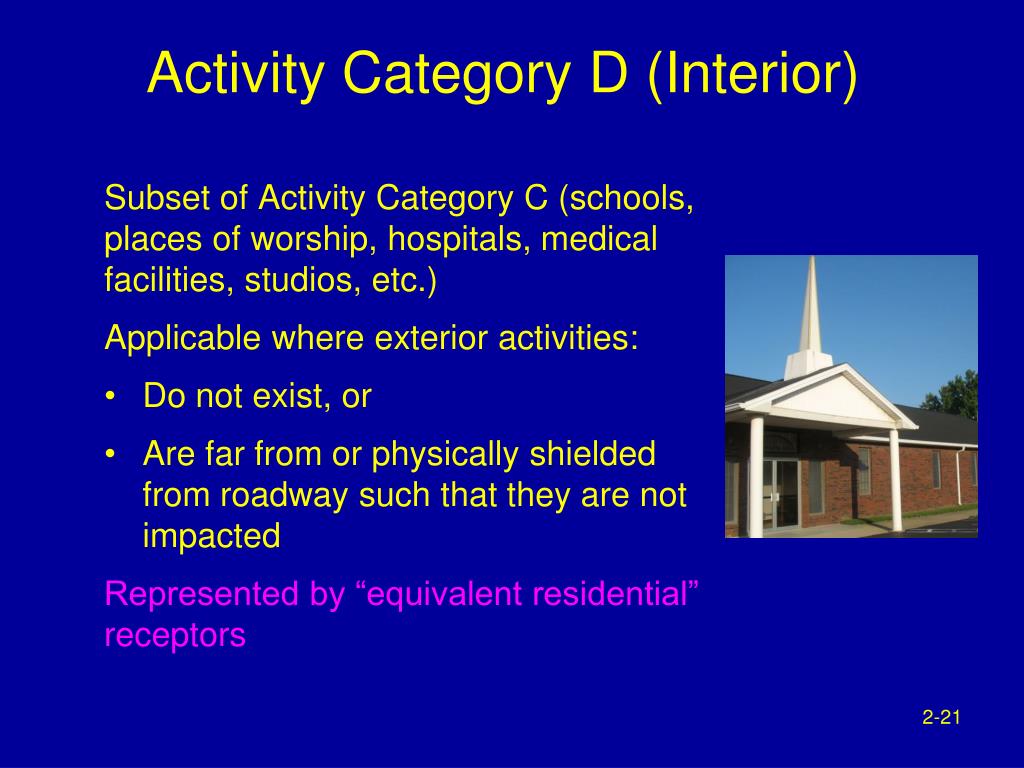 Activity Category D (Interior) Subset of Activity Category C (schools, places of worship, hospitals, medical facilities, studios, etc.) Applicable where exterior activities: • Do not exist, or • Are far from or physically shielded from roadway such that they are not impacted • Represented by “equivalent residential” receptors