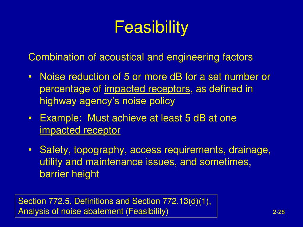 Feasibility Combination of acoustical and engineering factors • Noise reduction of 5 or more dB for a set number or percentage of impacted receptors, as defined in highway agency’s noise policy • Example: Must achieve at least 5 dB at one impacted receptor • Safety, topography, access requirements, drainage, utility and maintenance issues, and sometimes, barrier height Section 772.5, Definitions and Section 772.13(d)(1), Analysis of noise abatement (Feasibility)