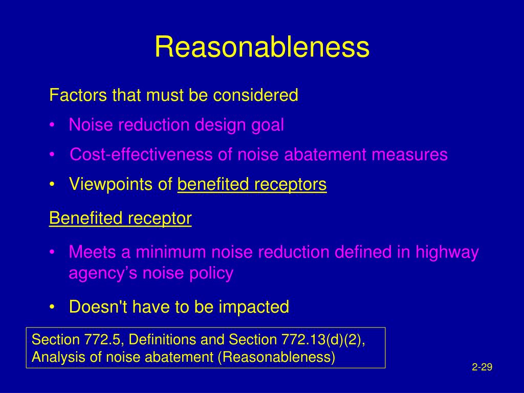 Reasonableness:Noise Reduction Design Goal Minimum required reduction of future noise levels Must be met for a set number or percentage of benefited receptors, as defined in highway agency’s noise policy Examples: • Must achieve at least 7 dB at majority of benefited receptors • Must achieve at least 10 dB at one benefited receptor Section 772.5, Definitions and Section 772.13(d)(2)(iii), Analysis of noise abatement (Noise reduction design goals)