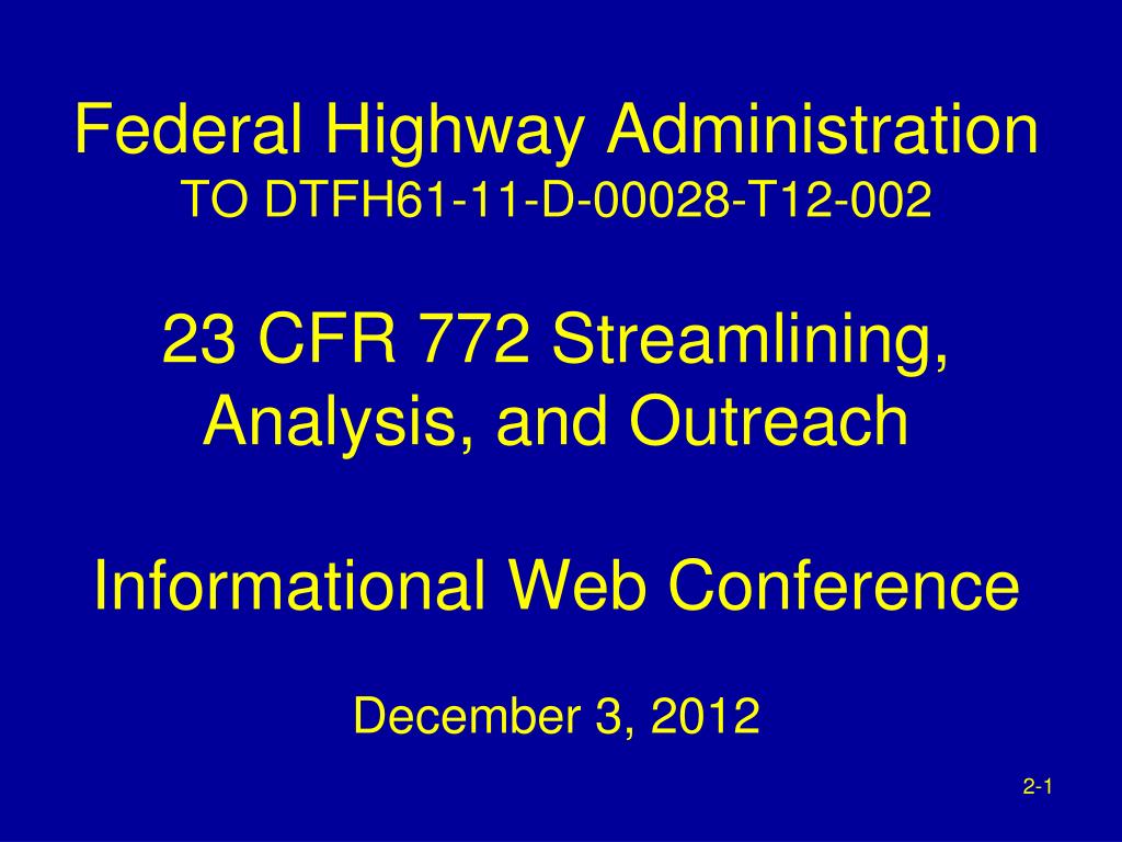 Federal Highway Administration TO DTFH61-11-D-00028-T12-002 23 CFR 772 Streamlining, Analysis, and Outreach Informational Web Conference December 3, 2012. Agenda. Welcome Goals of web conference Introductions of team and TWG Presentation on key elements of 23 CFR 772