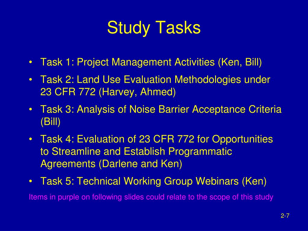 Study Tasks (again) • Task 1: Project Management Activities (Ken, Bill) • Task 2: Land Use Evaluation Methodologies under 23 CFR 772 (Harvey, Ahmed) • Task 3: Analysis of Noise Barrier Acceptance Criteria (Bill) • Task 4: Evaluation of 23 CFR 772 for Opportunities to Streamline and Establish Programmatic Agreements (Darlene and Ken) • Task 5: Technical Working Group Webinars (Ken)