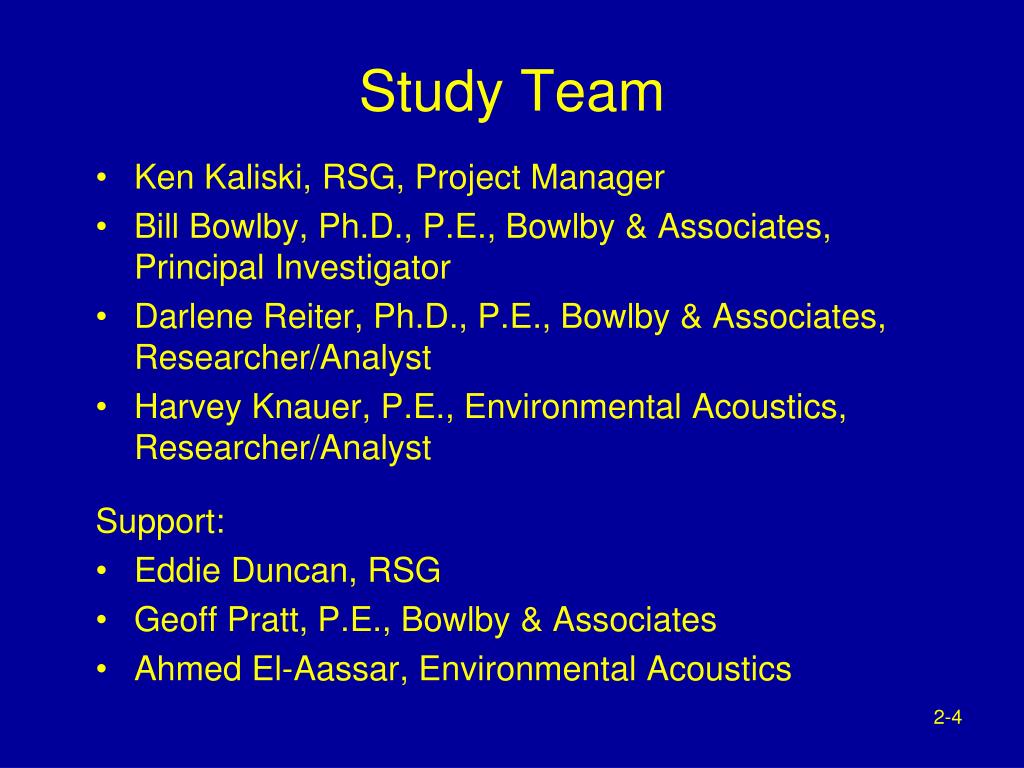 Study Team • Ken Kaliski, RSG, Project Manager • Bill Bowlby, Ph.D., P.E., Bowlby & Associates, Principal Investigator • Darlene Reiter, Ph.D., P.E., Bowlby & Associates, Researcher/Analyst • Harvey Knauer, P.E., Environmental Acoustics, Researcher/Analyst Support: • Eddie Duncan, RSG • Geoff Pratt, P.E., Bowlby & Associates • Ahmed El-Aassar, Environmental Acoustics