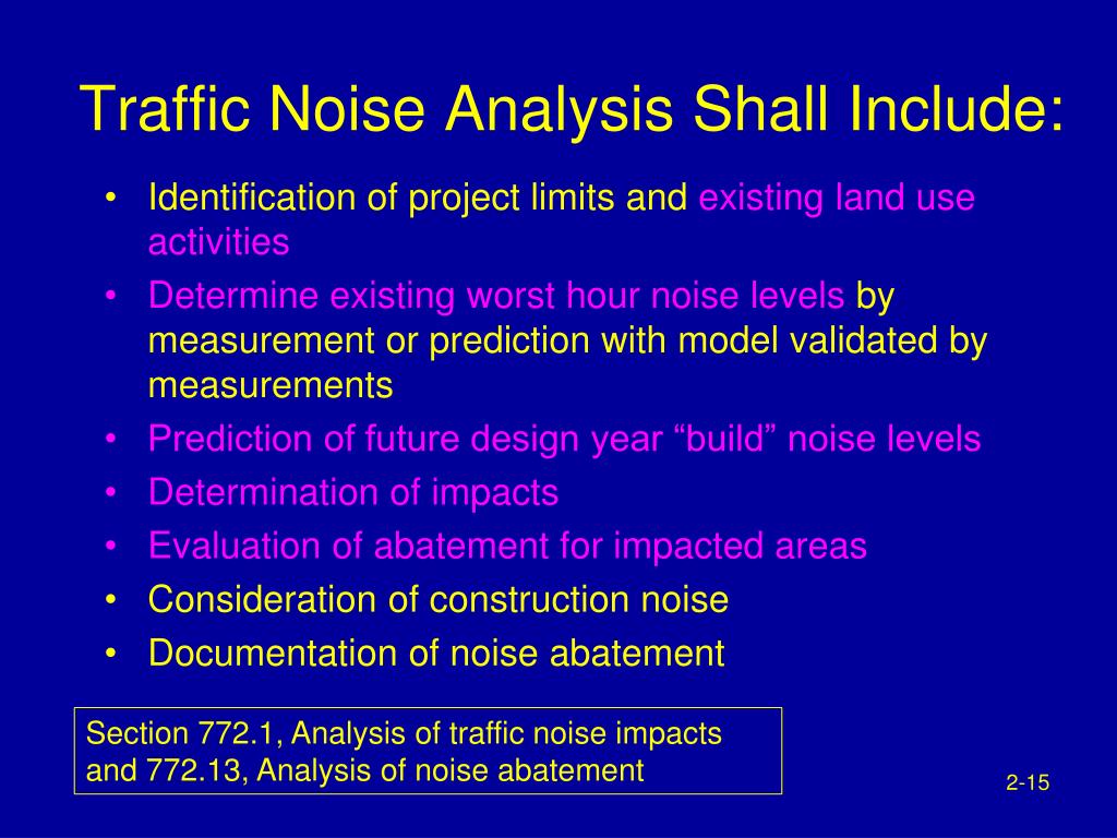 Traffic Noise Analysis Shall Include: • Identification of project limits and existing land use activities • Determine existing worst hour noise levels by measurement or prediction with model validated by measurements • Prediction of future design year “build” noise levels • Determination of impacts • Evaluation of abatement for impacted areas • Consideration of construction noise • Documentation of noise abatement Section 772.1, Analysis of traffic noise impacts and 772.13, Analysis of noise abatement