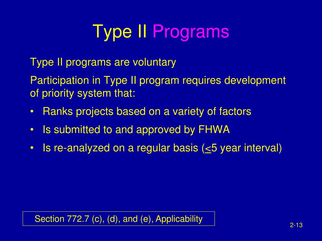 Type II Programs • Type II programs are voluntary Participation in Type II program requires development of priority system that: • Ranks projects based on a variety of factors • Is submitted to and approved by FHWA • Is re-analyzed on a regular basis (<5 year interval) Section 772.7 (c), (d), and (e), Applicability