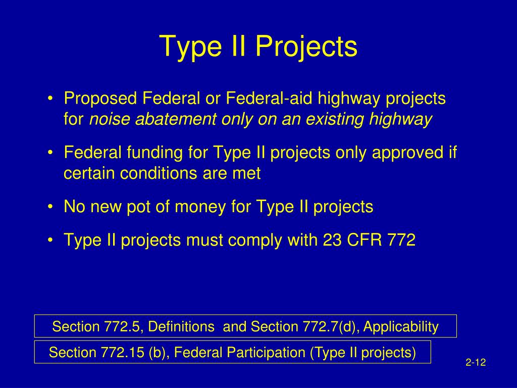 Type II Projects • Proposed Federal or Federal-aid highway projects for noise abatement only on an existing highway • Federal funding for Type II projects only approved if certain conditions are met • No new pot of money for Type II projects • Type II projects must comply with 23 CFR 772 Section 772.5, Definitions and Section 772.7(d), Applicability Section 772.15 (b), Federal Participation (Type II projects)