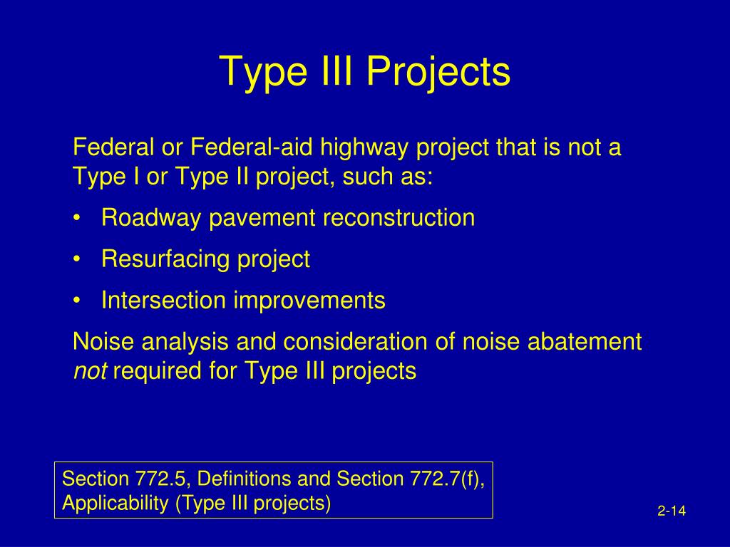 Type III Projects Federal or Federal-aid highway project that is not a Type I or Type II project, such as: • Roadway pavement reconstruction • Resurfacing project • Intersection improvements Noise analysis and consideration of noise abatement notrequired for Type III projects Section 772.5, Definitions and Section 772.7(f), Applicability (Type III projects)