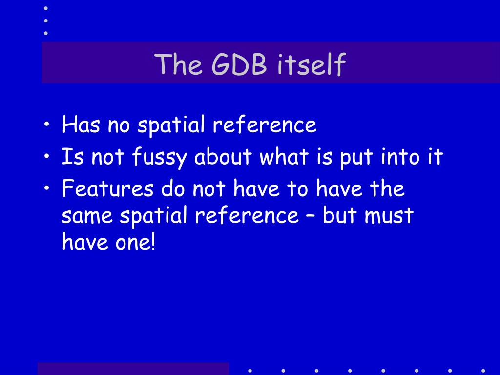 The GDB itself • Has no spatial reference • Is not fussy about what is put into it • Features do not have to have the same spatial reference – but must have one!