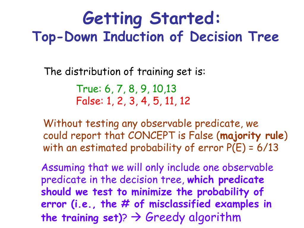 Getting Started:Top-Down Induction of Decision Tree The distribution of training set is: True: 6, 7, 8, 9, 10,13 False: 1, 2, 3, 4, 5, 11, 12 Without testing any observable predicate, we could report that CONCEPT is False (majority rule) with an estimated probability of error P(E) = 6/13 Assuming that we will only include one observable predicate in the decision tree, which predicateshould we test to minimize the probability of error (i.e., the # of misclassified examples in the training set)? Greedy algorithm
