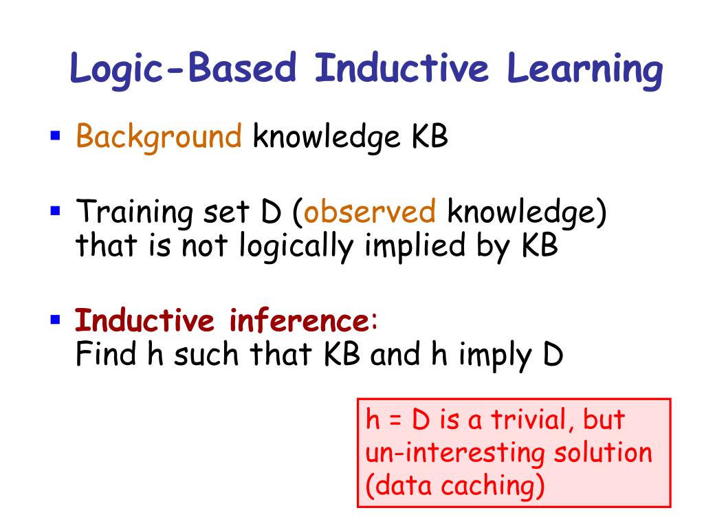 Logic-Based Inductive Learning • Background knowledge KB • Training set D (observed knowledge) that is not logically implied by KB • Inductive inference:Find h such that KB and h imply D h = D is a trivial, but un-interesting solution (data caching)