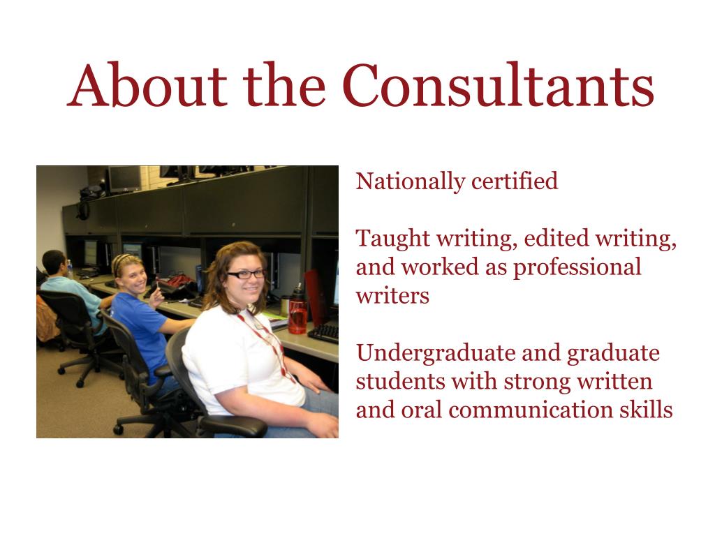 About the Consultants Nationally certified Taught writing, edited writing, and worked as professional writers Undergraduate and graduate students with strong written and oral communication skills