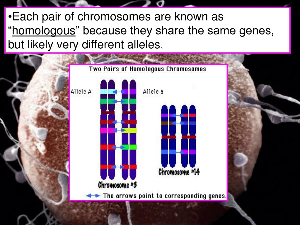 Each pair of chromosomes are known as “homologous” because they share the same genes, but likely very different alleles.