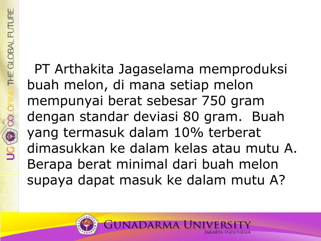 Sepuluh persen terbaik, berarti pada kisaran nilai tertinggi sampai terendah dalam kelompok tersebut mempunyai luas 0,1 atau 10%. Ingat bahwa luas daerah normal kalau dibagi 2 adalah 0,5, maka luas sisa dari daerahnya adalah 0,4 yang diperoleh dari 0,5 – 0,1. Untuk memperoleh nilai Z, maka anda dapat melihat berapa nilai Z untuk luas dibawah kurva normal sebesar 0,4000. Apabila Anda lihat pada tabel luas di bawah kurva normal, maka yang mendekati 0,4000 adalah angka 0,3997 dan mempunyai nilai Z = 1,28. Dari nilai Z, maka dapat diperoleh nilai X yang merupakan nilai terendah dari interval 10% tertinggi. Z = (X - ) / S 1,28 = (X – 750) / 8 X = (1,28 X 8) +750 = 760,24 Jadi berat minimal dari buah melon untuk kelas atau mutu A adalah 760,24 gram.