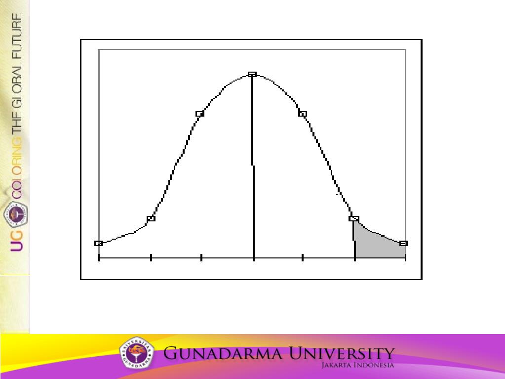 Jawab: P(800<X<1.000)? • Hitung nilai Z Z1 = (800-900)/50 = -2,00; Z2 = (1.000-900)/50 = 2,00 • Jadi: P(800<X<1.000) =P(-2,00<Z<2,00); P(-2,00<Z) = 0,4772 dan P(Z>2,00) = 0,4772 Sehingga luas daerah yang diarsir adalah = 0,4772+0,4772= 0,9544. Jadi P(800<X<1.000) = P(-2,00 < Z<2,00) = 0,9544. Jadi 95,44% produksi berada pada kisaran 800-1.000 jam. Jadi jika PT Work Electric mengklaim bahwa lampu bohlamnya menyala 800-1.000 jam, mempunyai probabilitas benar 95,44%, sedang sisanya 4,56% harus dipersiapkan untuk garansi.