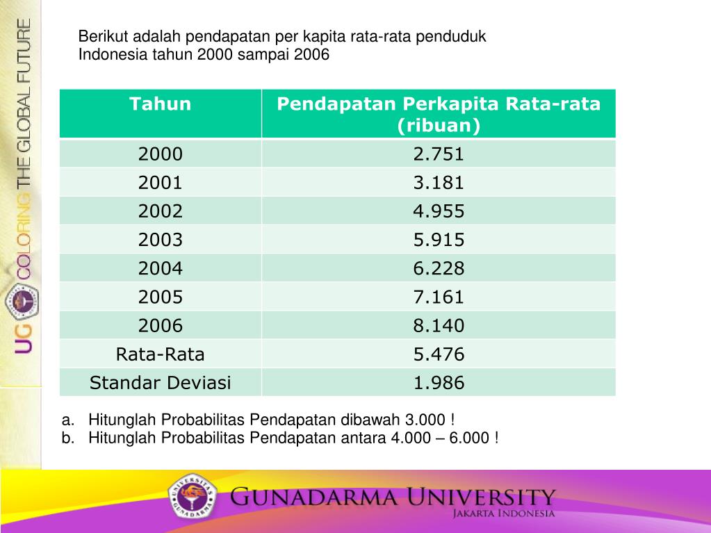 Berikut adalah pendapatan per kapita rata-rata penduduk Indonesia tahun 2000 sampai 2006 • Hitunglah Probabilitas Pendapatan dibawah 3.000 ! • Hitunglah Probabilitas Pendapatan antara 4.000 – 6.000 !