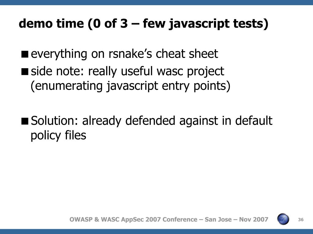 demo time (0 of 3 – few javascript tests) • everything on rsnake’s cheat sheet • side note: really useful wasc project (enumerating javascript entry points) • Solution: already defended against in default policy files