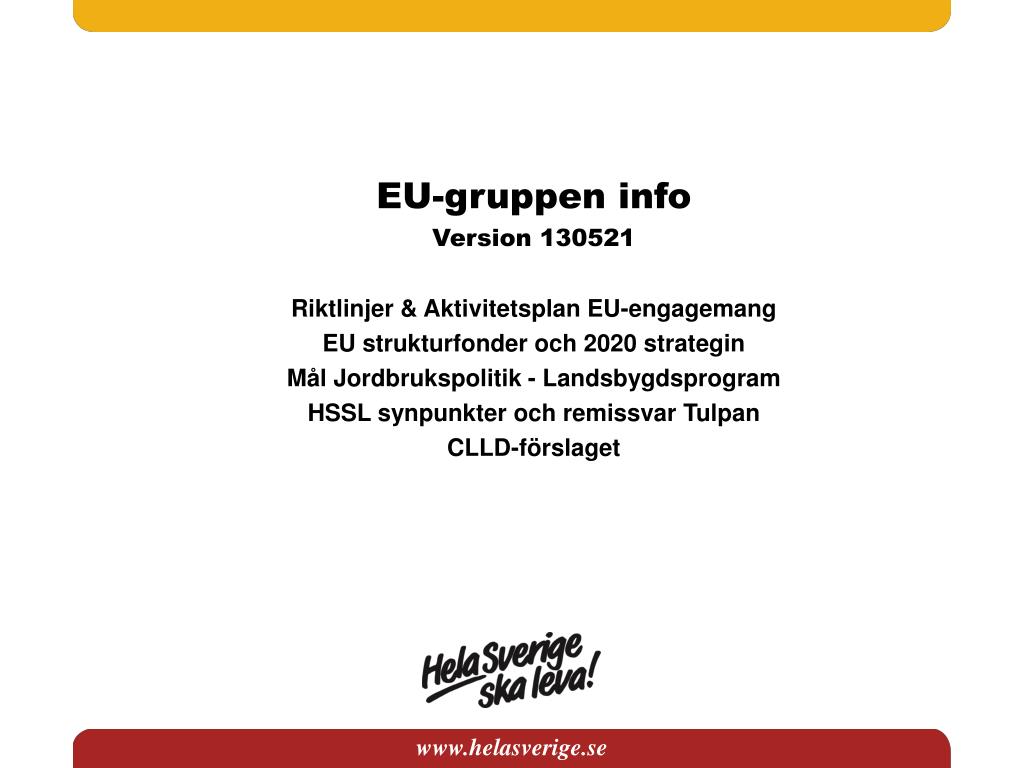 EU-gruppen info Version 130521 Riktlinjer & Aktivitetsplan EU-engagemang EU strukturfonder och 2020 strategin Mål Jordbrukspolitik - Landsbygdsprogram HSSL synpunkter och remissvar Tulpan CLLD-förslaget