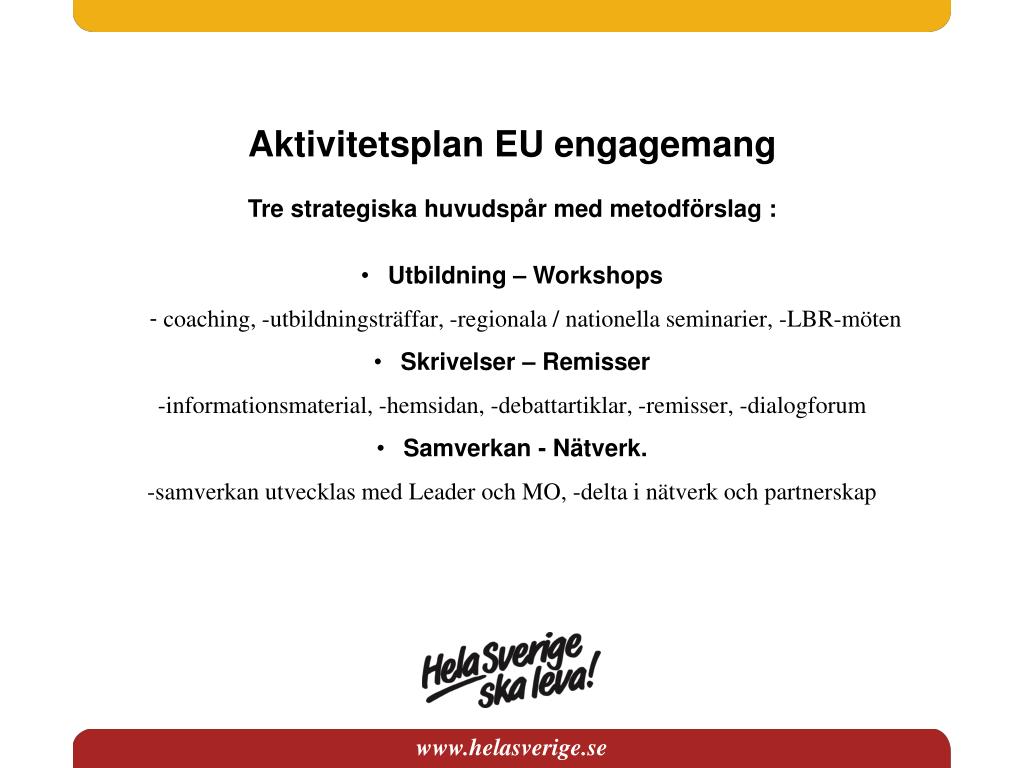 Aktivitetsplan EU engagemang • Tre strategiska huvudspår med metodförslag : • Utbildning – Workshops-coaching, -utbildningsträffar, -regionala / nationella seminarier, -LBR-möten • Skrivelser – Remisser • -informationsmaterial, -hemsidan, -debattartiklar, -remisser, -dialogforum • Samverkan - Nätverk. • -samverkan utvecklas med Leader och MO, -delta i nätverk och partnerskap