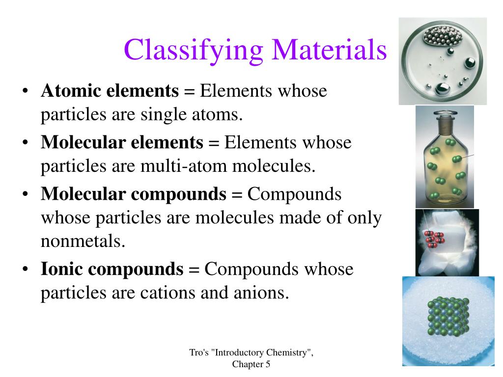 Classifying Materials • Atomic elements = Elements whose particles are single atoms. • Molecular elements = Elements whose particles are multi-atom molecules. • Molecular compounds = Compounds whose particles are molecules made of only nonmetals. • Ionic compounds = Compounds whose particles are cations and anions. Tro's "Introductory Chemistry", Chapter 5