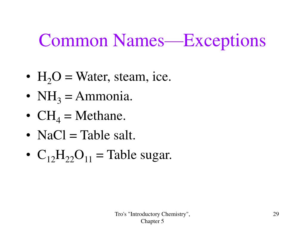 Common Names—Exceptions • H2O = Water, steam, ice. • NH3 = Ammonia. • CH4 = Methane. • NaCl = Table salt. • C12H22O11 = Table sugar. Tro's "Introductory Chemistry", Chapter 5